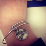 Update: It’s an Alex and Ani bracelet – 20 percent of the proceeds go to pancreatic cancer research 🙂 http://www.alexandani.com/today-is-an-opportunity-expandable-wire-bangle-russian-gold.html