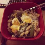 Spring gemelli pasta: sugar snap peas, garlic, lemon, capers, and a soft boiled egg topped with cheese!